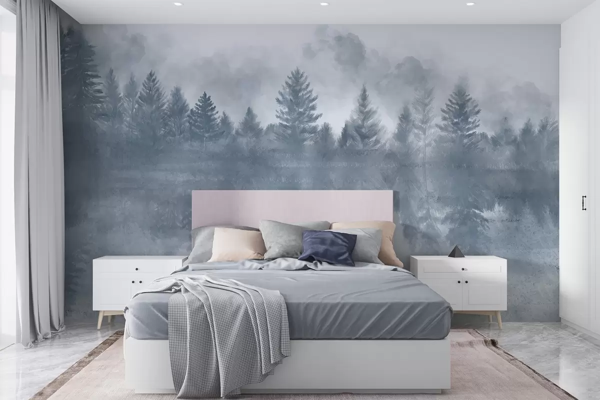 Τοιχογραφίες Ένα γαλήνιο τοπίο με μια παγωμένη λίμνη που περιβάλλεται από ένα πυκνό πευκοδάσος, με μια ομιχλώδη, ομιχλώδη ατμόσφαιρα Nr. w08415