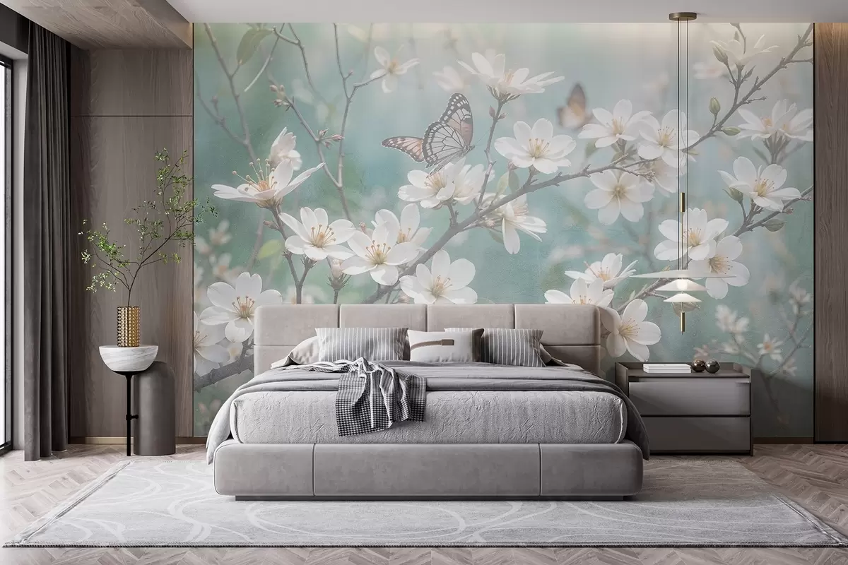 Τοιχογραφίες Μια λευκή πεταλούδα σε ένα κλαδί με λεπτά λευκά άνθη κερασιάς σε πρώτο πλάνο σε θολό φόντο Nr. w08421