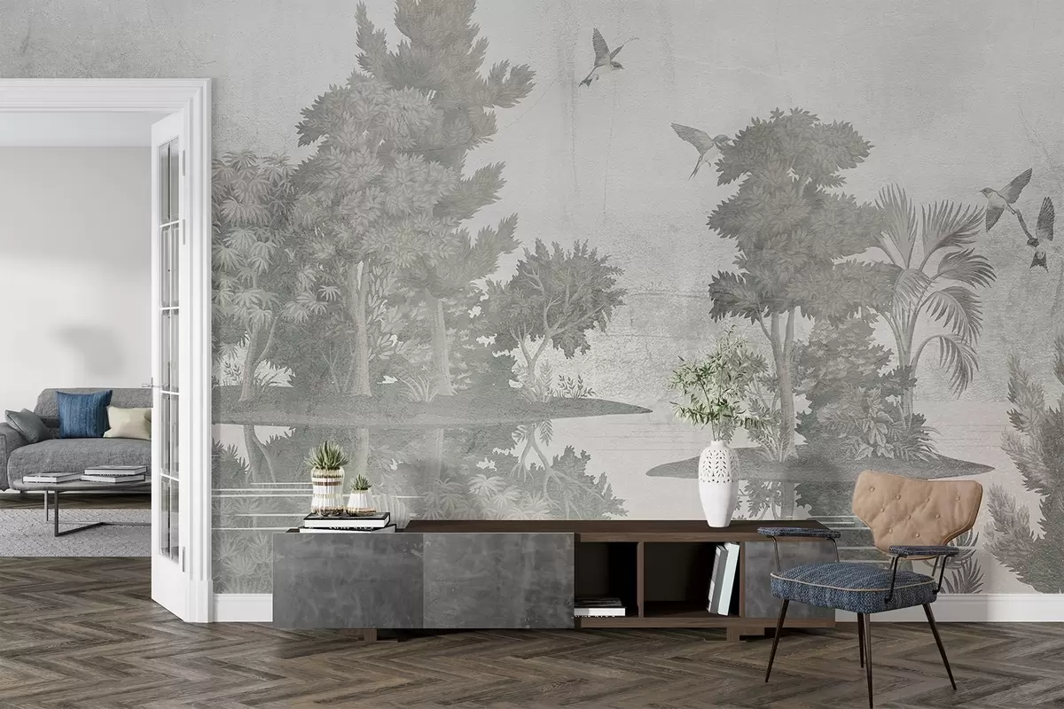 Τοιχογραφίες Εκτύπωση δασικού τοπίου με μια λίμνη που περιβάλλεται από πεύκα και άλλα φυλλώματα σε πράσινο φόντο με υφή Nr. w08426v1