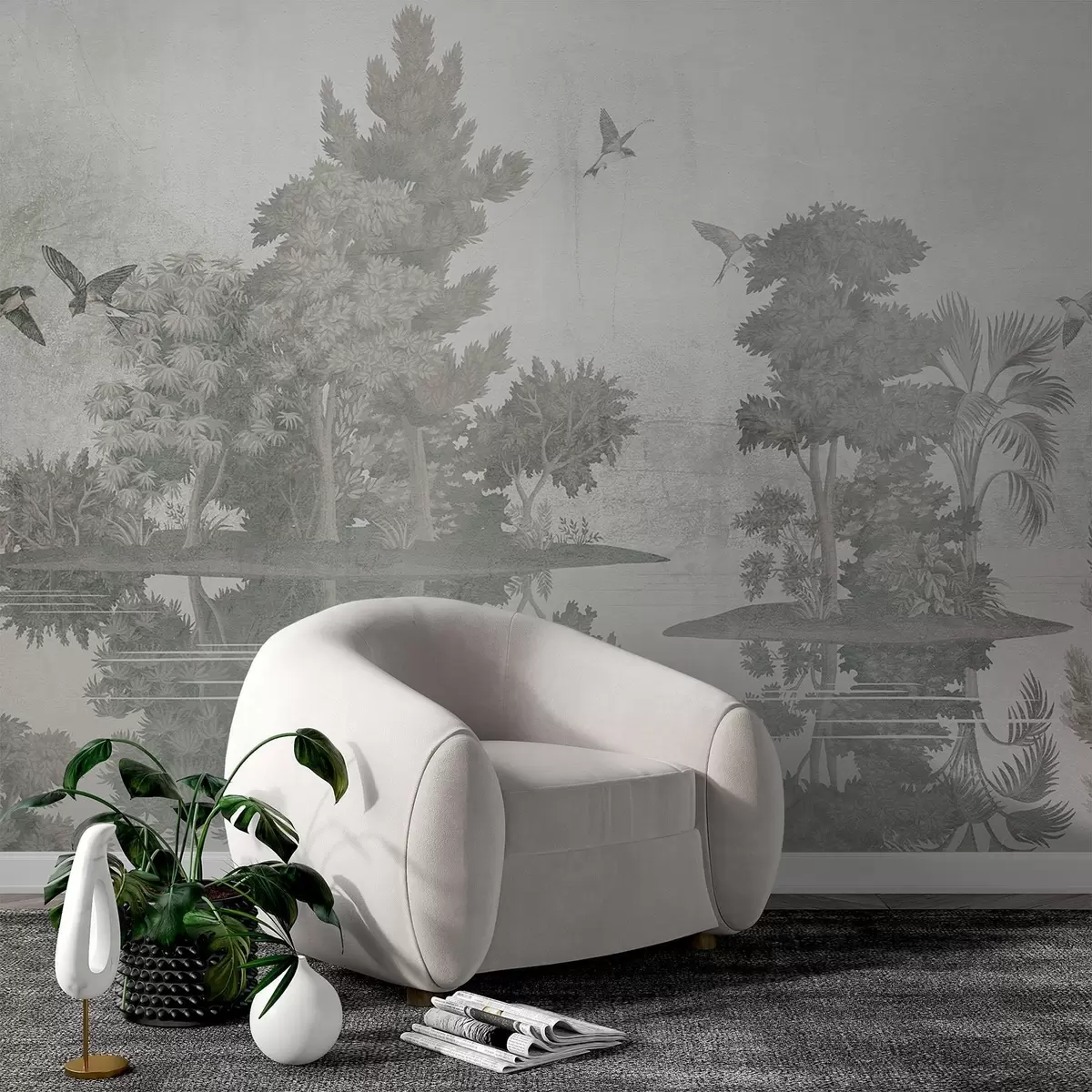 Τοιχογραφίες Εκτύπωση δασικού τοπίου με μια λίμνη που περιβάλλεται από πεύκα και άλλα φυλλώματα σε πράσινο φόντο με υφή Nr. w08426v1
