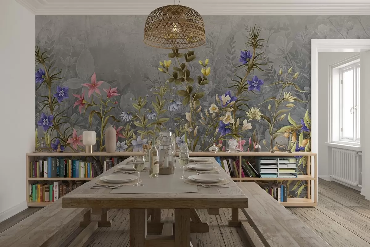 Τοιχογραφίες Μια πλούσια, ζωντανή εκτύπωση με πολύχρωμα λουλούδια και φυτά με περίπλοκες λεπτομέρειες και υφές Nr. w08428v1
