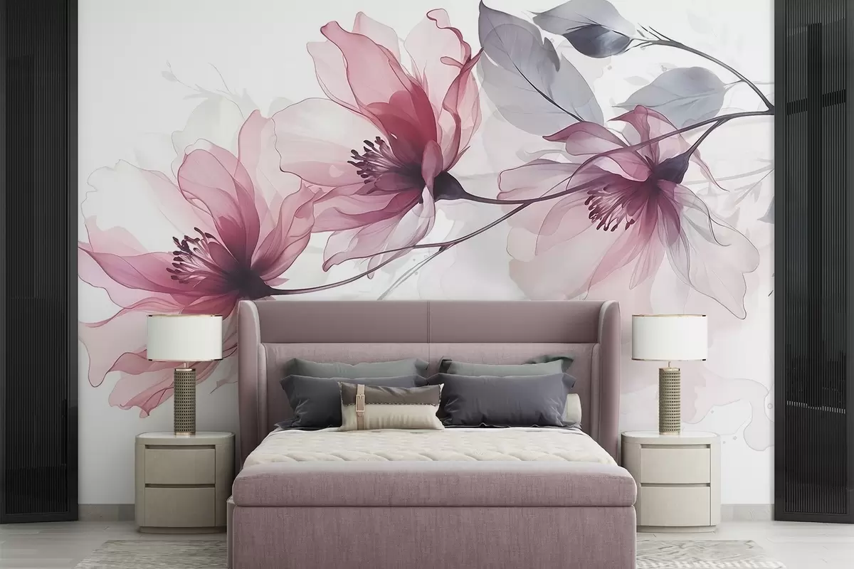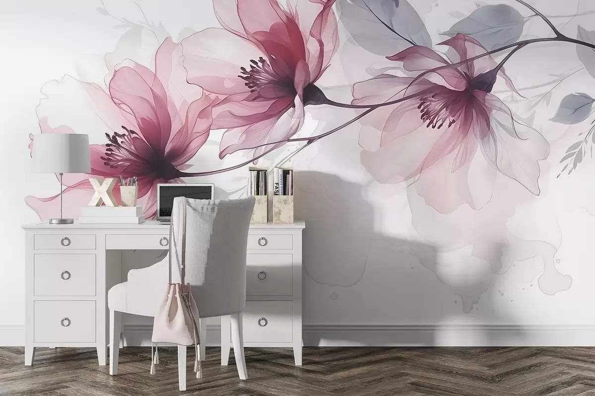 Τοιχογραφίες Λεπτά διαφανή ροζ και γκρι λουλούδια με μαλακά, θολά πέταλα σε λευκό φόντο Nr. w08429