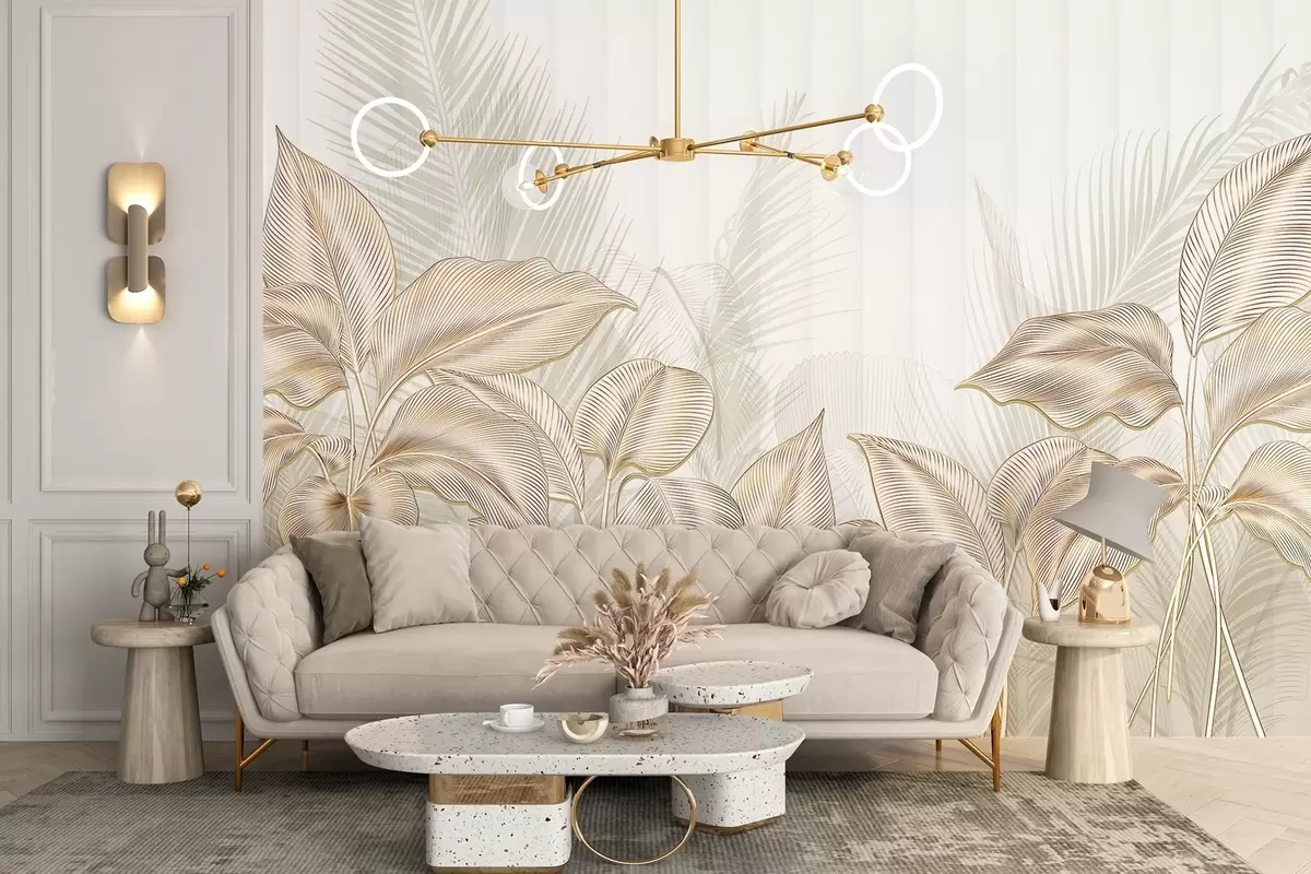 Τοιχογραφίες Κομψά λευκά και μπεζ φοινικόφυλλα σε ανοιχτόχρωμο φόντο με υφή Nr. w08434