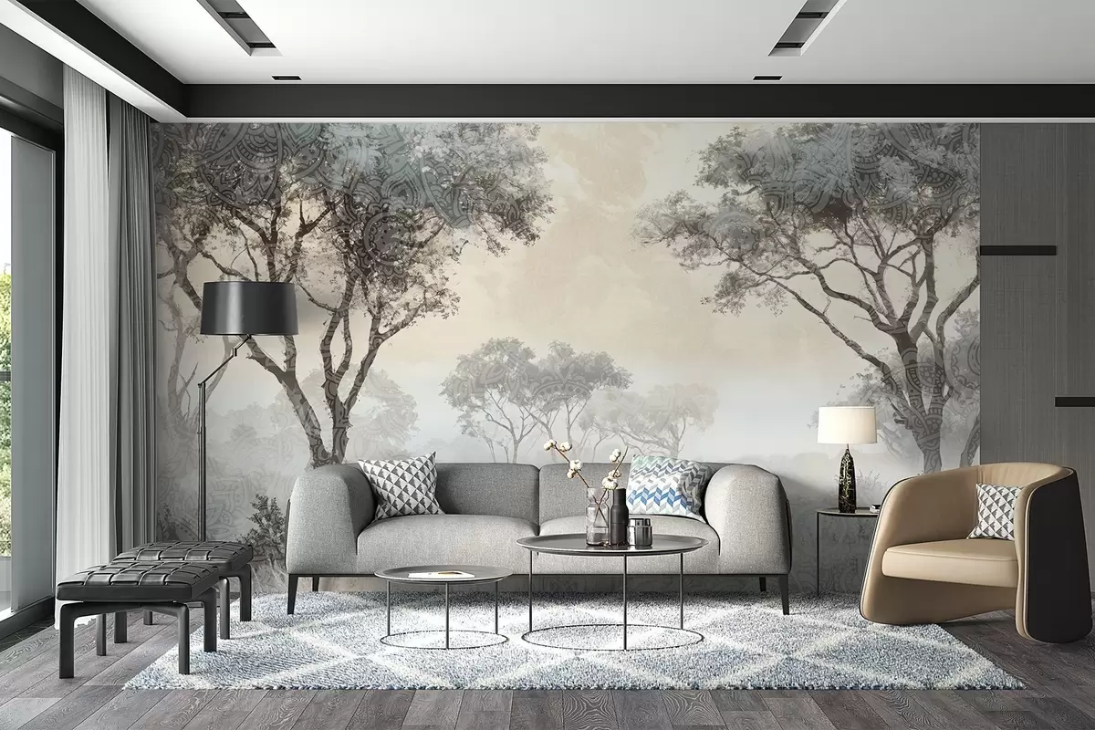 Τοιχογραφίες Ένα ομιχλώδες, γαλήνιο τοπίο με σκιαγραφημένα δέντρα στο προσκήνιο με απαλή ομίχλη σε αποχρώσεις του γκρι και του μπεζ Nr. w08442v1
