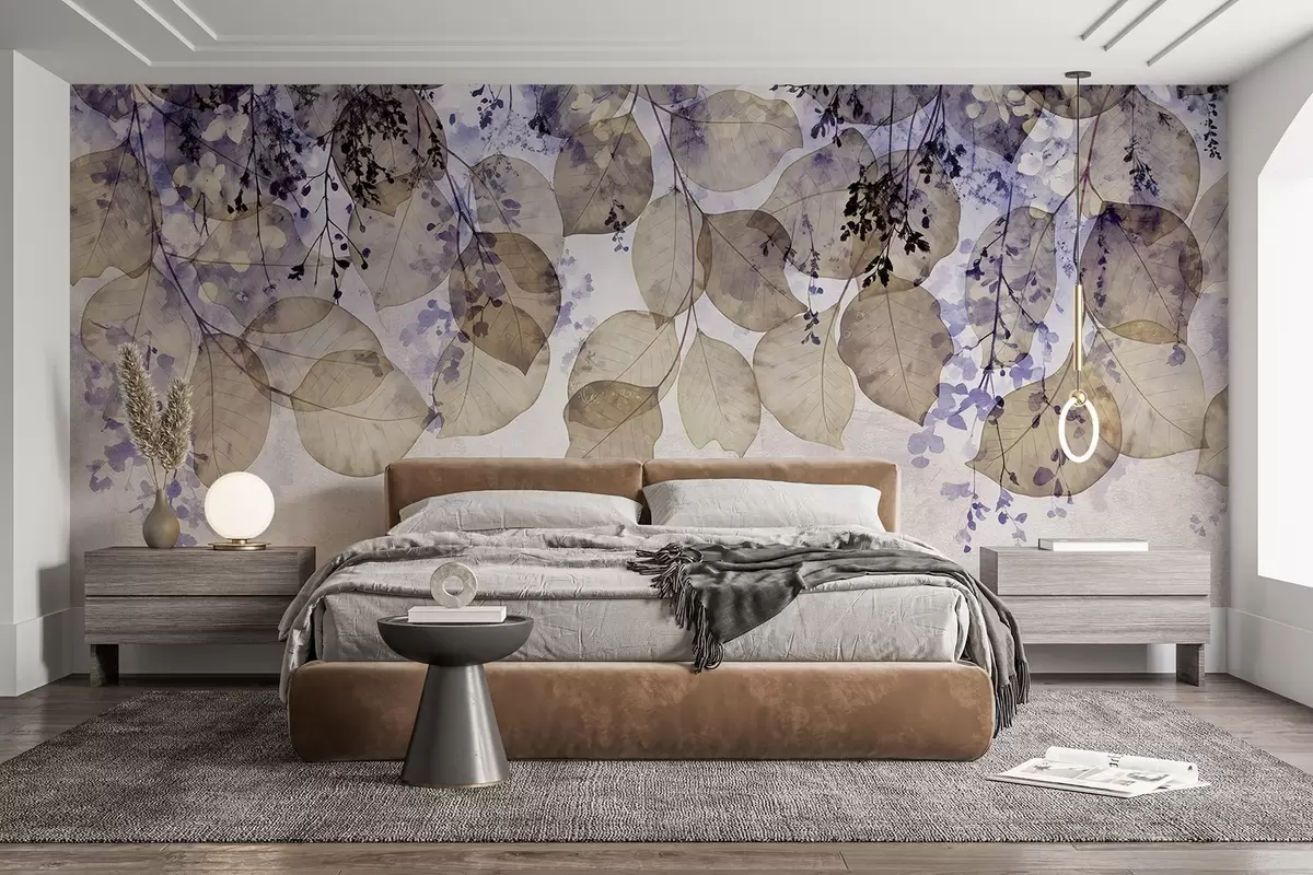 Τοιχογραφίες Λεπτά αποξηραμένα φύλλα και άνθη σε αποχρώσεις του μοβ, του μπεζ και του λευκού σε ελαφρύ φόντο με υφή Nr. w08447