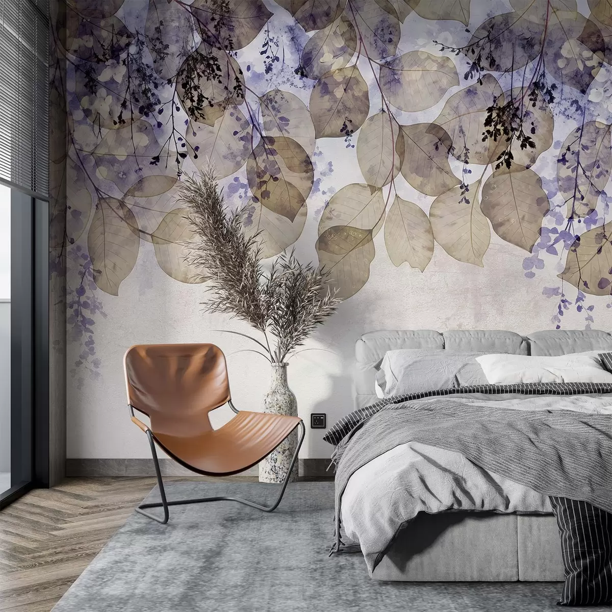 Τοιχογραφίες Λεπτά αποξηραμένα φύλλα και άνθη σε αποχρώσεις του μοβ, του μπεζ και του λευκού σε ελαφρύ φόντο με υφή Nr. w08447