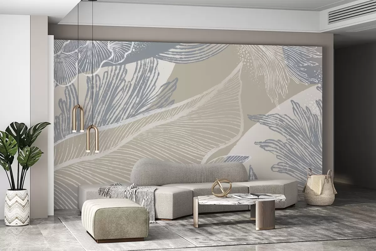 Τοιχογραφίες Παστέλ μπλε και λευκή αφηρημένη εκτύπωση με οργανικά σχήματα και γραμμές με υποτονική χρωματική παλέτα Nr. w08450