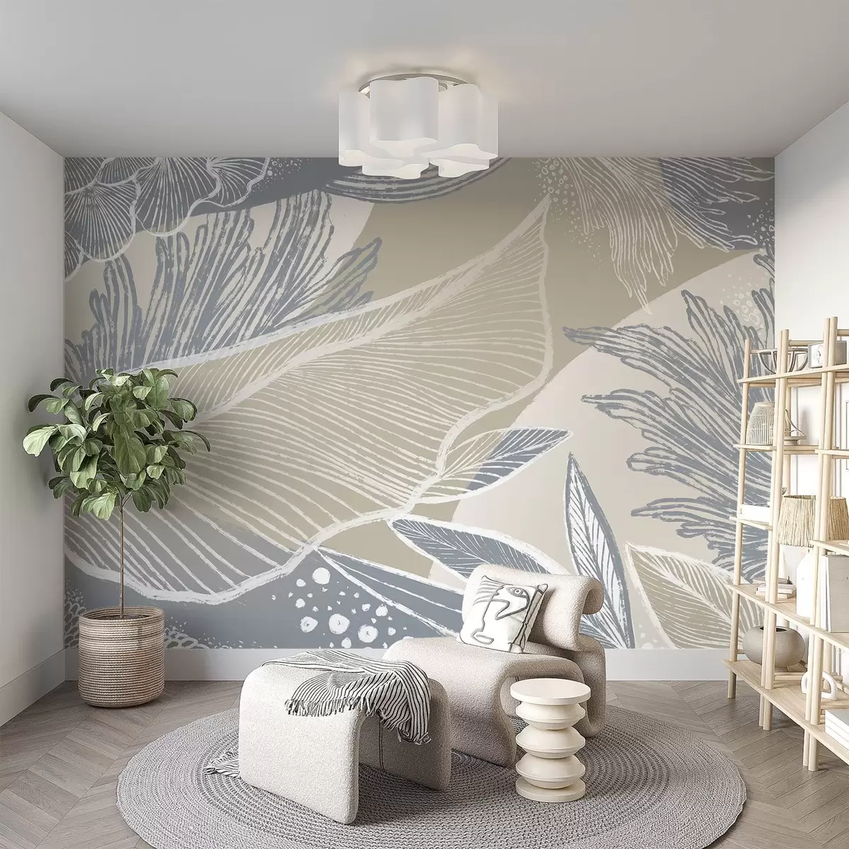 Τοιχογραφίες Παστέλ μπλε και λευκή αφηρημένη εκτύπωση με οργανικά σχήματα και γραμμές με υποτονική χρωματική παλέτα Nr. w08450