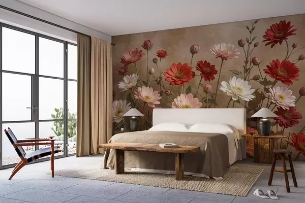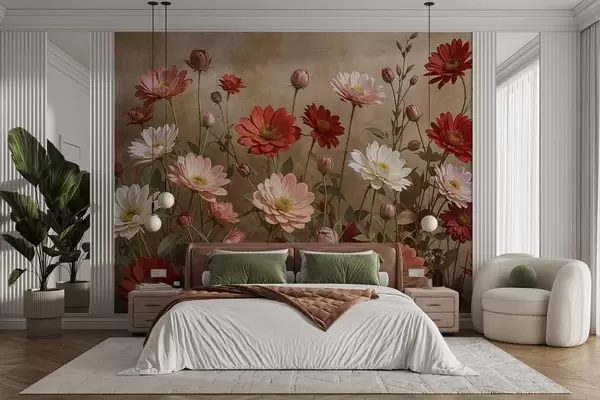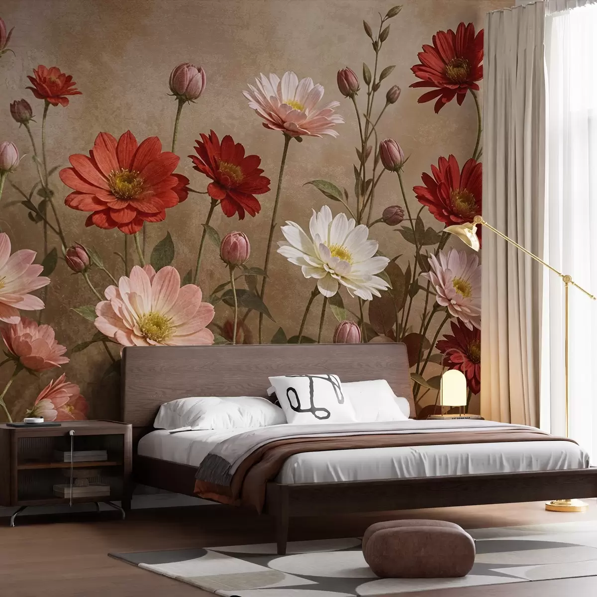 Τοιχογραφίες Ένα πεδίο με πολύχρωμα λουλούδια που μοιάζουν με μαργαρίτες σε διάφορες αποχρώσεις του ροζ , του κόκκινου και του λευκού σε φόντο με υφή Nr. w08462
