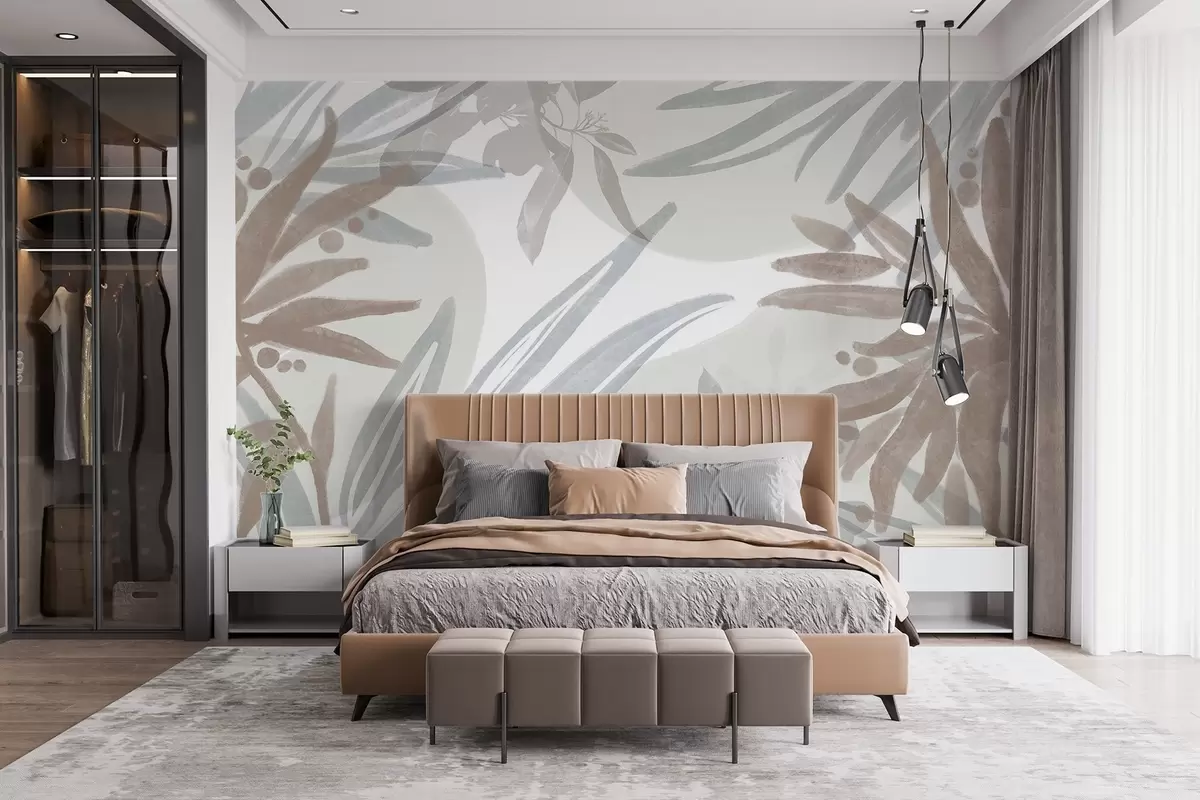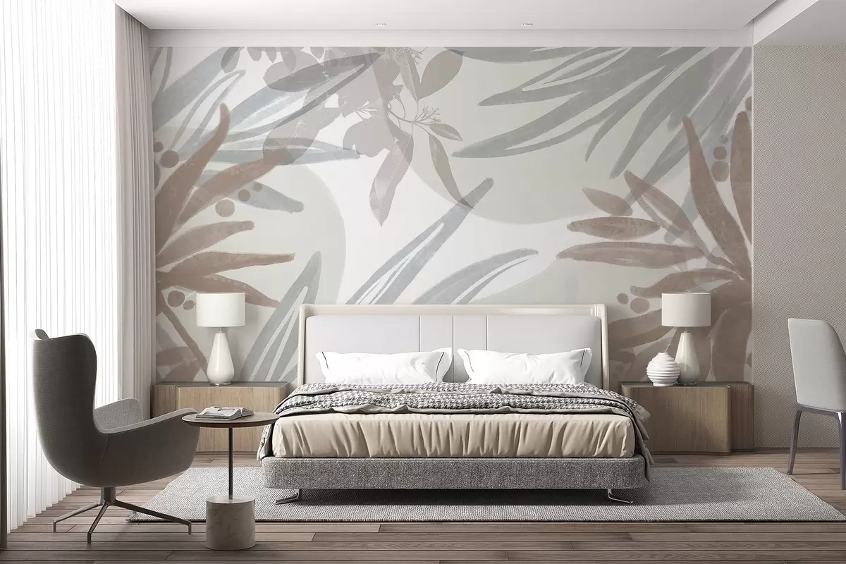 Τοιχογραφίες Ένα αφηρημένο φλοράλ μοτίβο σε ουδέτερους τόνους με επικαλυπτόμενα φύλλα και σχήματα σε αποχρώσεις του γκρι , του λευκού και του μπεζ Nr. w08464