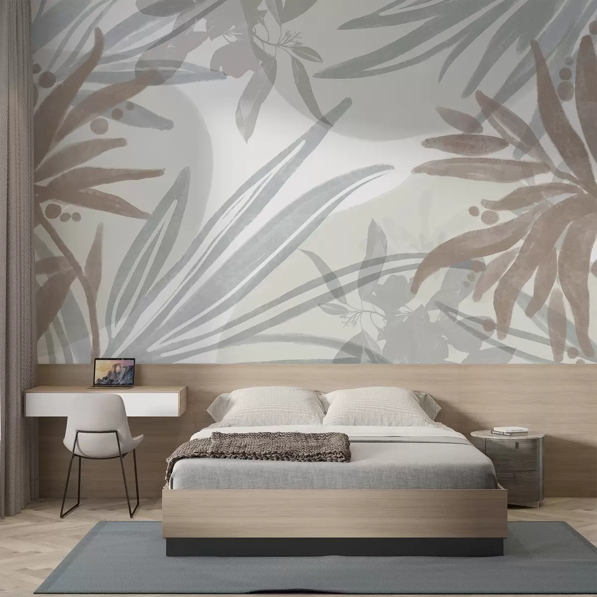Τοιχογραφίες Ένα αφηρημένο φλοράλ μοτίβο σε ουδέτερους τόνους με επικαλυπτόμενα φύλλα και σχήματα σε αποχρώσεις του γκρι , του λευκού και του μπεζ Nr. w08464