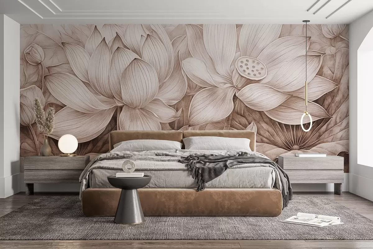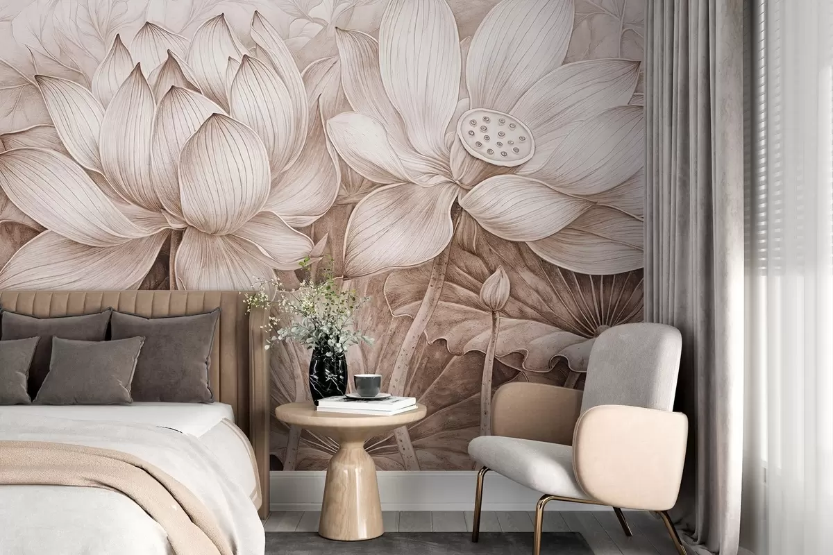 Τοιχογραφίες Αρκετά λεπτομερή υφή μεγάλα μπεζ λουλούδια λωτού με καφέ φύλλα και μίσχους σε ανοιχτό φόντο Nr. w08465v1