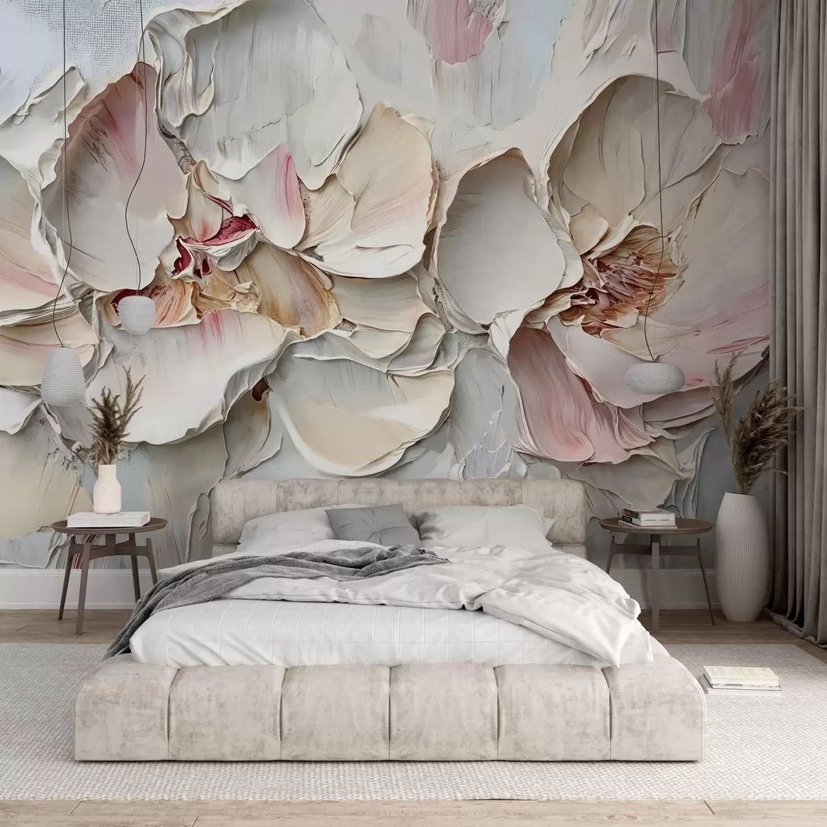 Τοιχογραφίες Λεπτά, απαλό ροζ λουλούδια με απαλά, πολυεπίπεδα πέταλα σε ένα υποτονικό, υφή φόντο με απομίμηση ελαιογραφίας impasto Nr. w08467