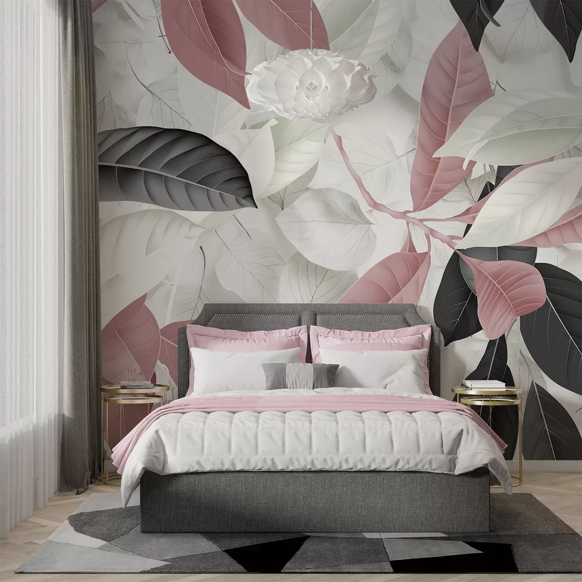 Τοιχογραφίες Μεγάλη εκτύπωση ροζ και γκρι φύλλων σε φόντο με ελαφριάς υφής φύλλα, δημιουργώντας μια πλούσια τροπική αίσθηση Nr. w08468