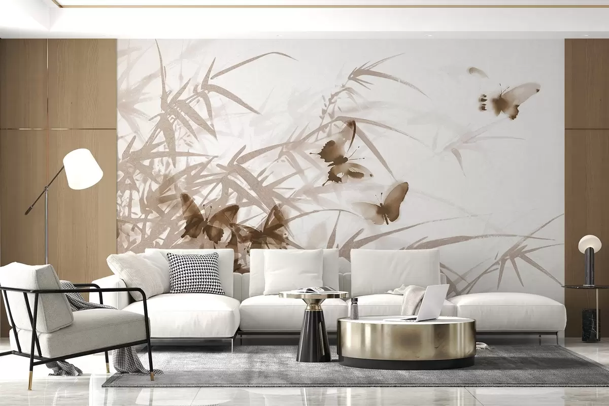 Τοιχογραφίες Φύλλα και μίσχοι μπαμπού με πετούμενες καφέ πεταλούδες με διαφανή φτερά Nr. w08524v1