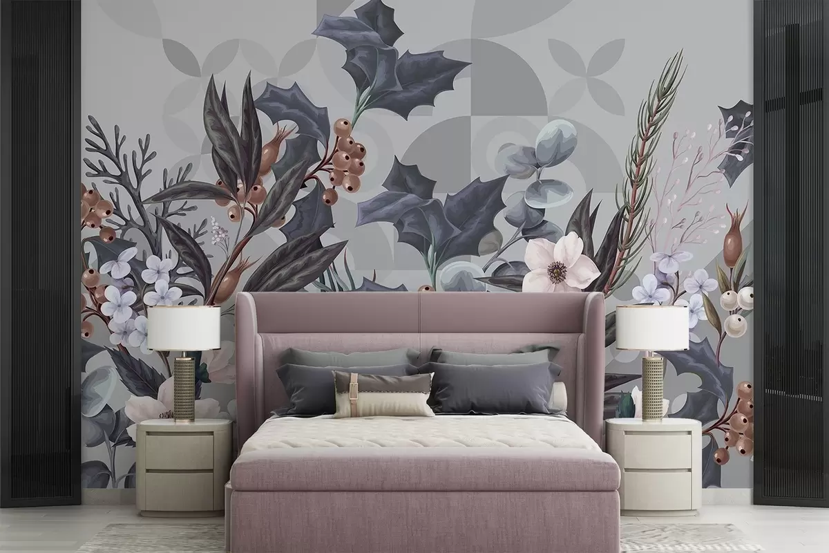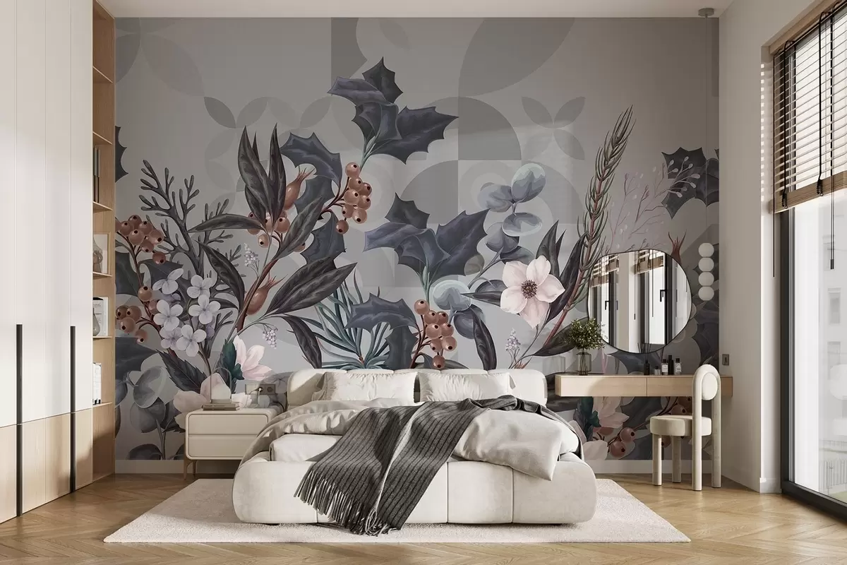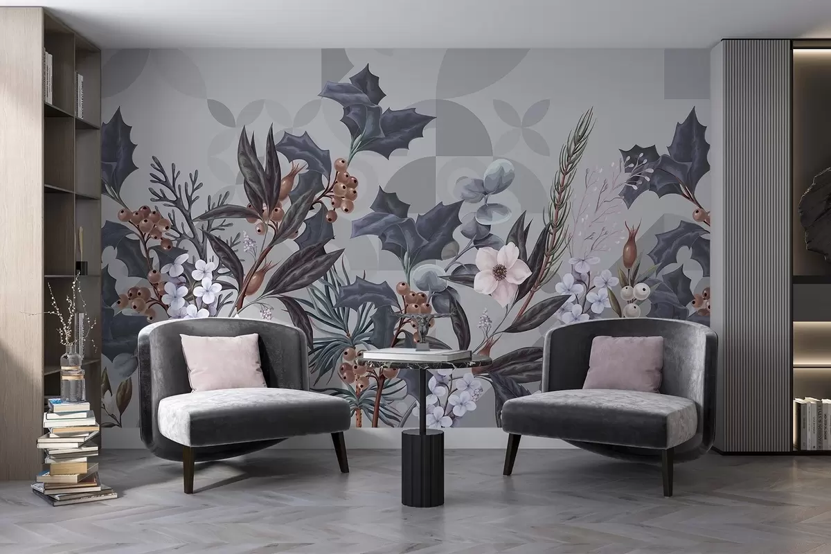 Τοιχογραφίες Φλοράλ σύνθεση με μεγάλα σκούρα φύλλα, λουλούδια και μούρα σε γκρίζο γεωμετρικό φόντο με αφηρημένο φόντο Nr. w08525