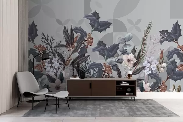 Τοιχογραφίες Φλοράλ σύνθεση με μεγάλα σκούρα φύλλα, λουλούδια και μούρα σε γκρίζο γεωμετρικό φόντο με αφηρημένο φόντο Nr. w08525