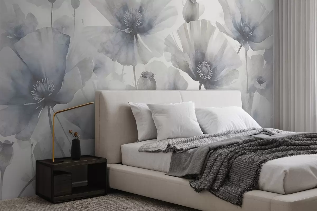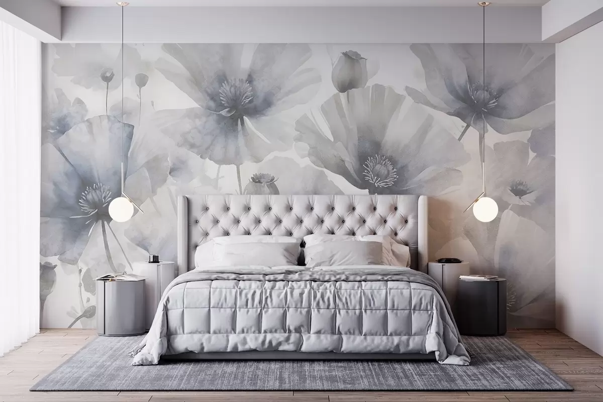 Τοιχογραφίες Λεπτή υφή γκρι και λευκά λουλούδια με μαλακά, θολά πέταλα σε λευκό φόντο Nr. w08526