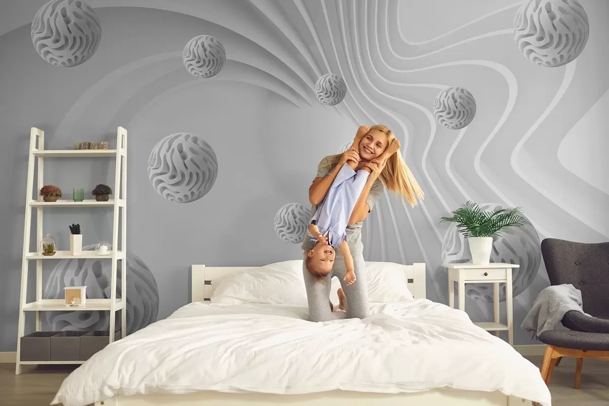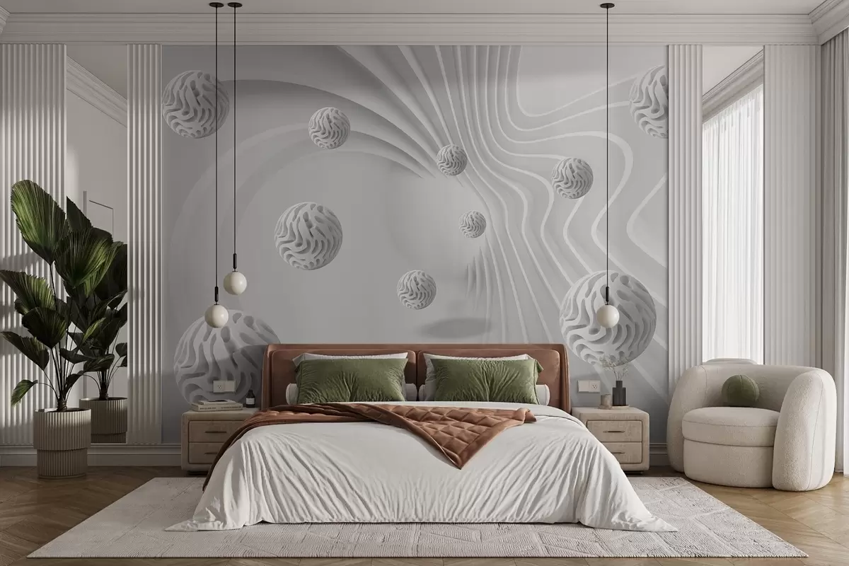 Τοιχογραφίες 3D γκρίζα αφαίρεση με σφαίρες και εφέ βάθους Nr. w08553