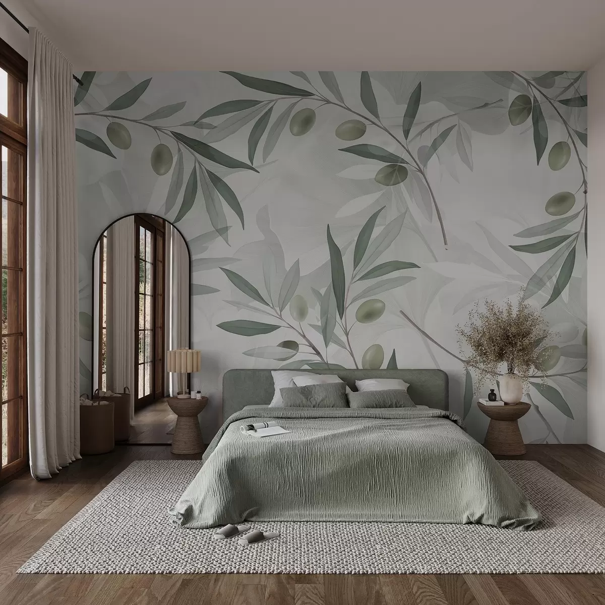 Τοιχογραφίες Κλαδιά ελιάς με πράσινα φύλλα και ελιές σε ανοιχτό φόντο Nr. w08576