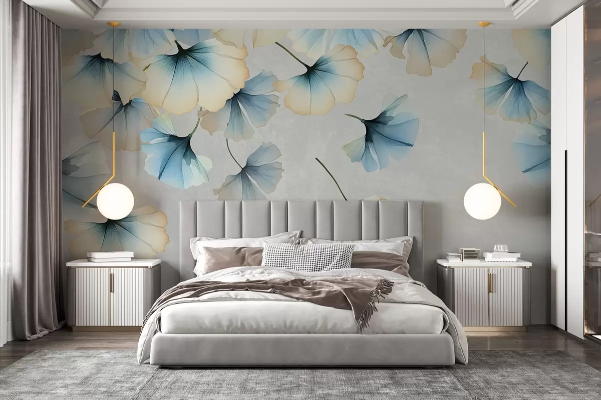 Τοιχογραφίες Μπλε και κίτρινα φύλλα γκίνγκο σε παστέλ χρώματα με λεπτά πέταλα που αιωρούνται στον αέρα σε φόντο με υφή Nr. w08578v1
