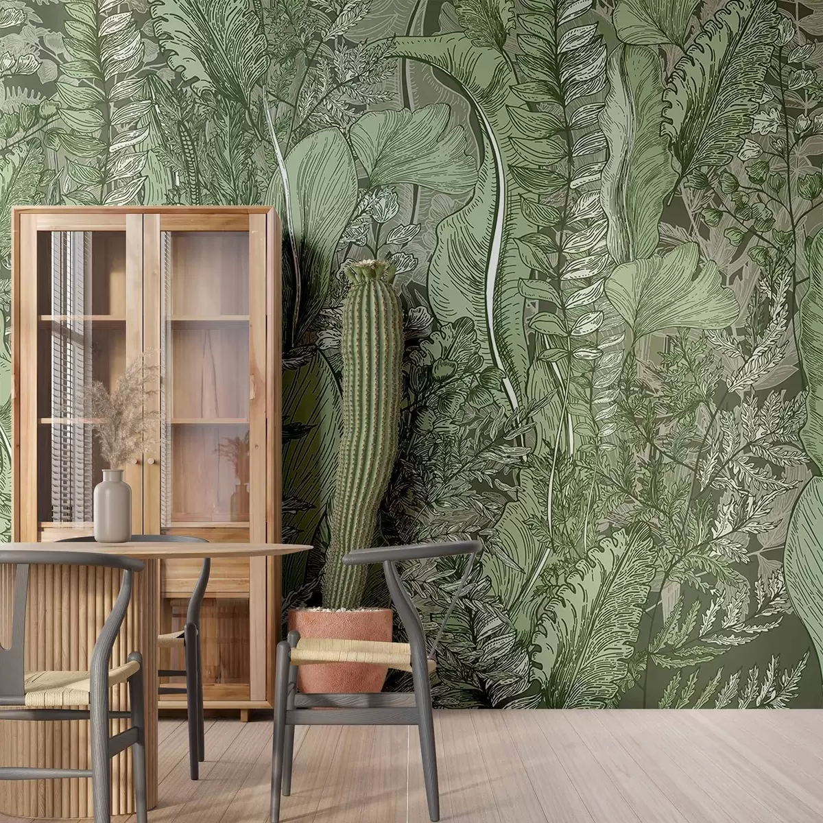 Τοιχογραφίες Ένα πλούσιο, καταπράσινο δάσος με διάφορα είδη φτερνών, φύλλα και φυλλώματα σε αποχρώσεις του πράσινου Nr. w08579