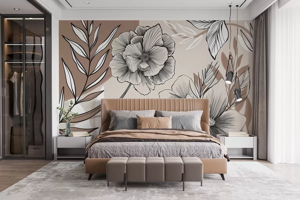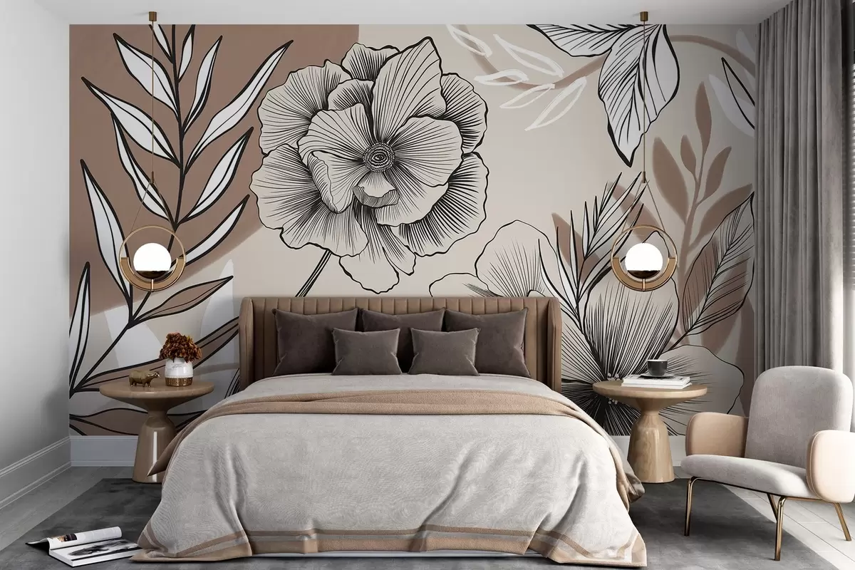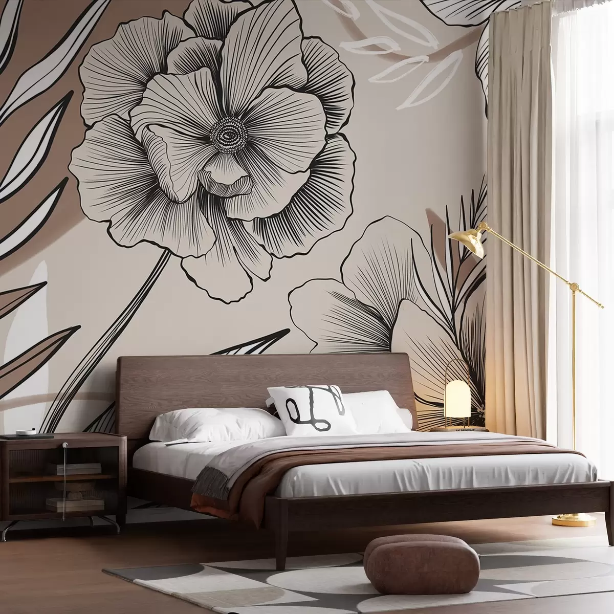 Τοιχογραφίες Μεγάλα ασπρόμαυρα γραφικά λουλούδια με λεπτομερή φύλλα σε μπεζ αφηρημένο φόντο Nr. w08580