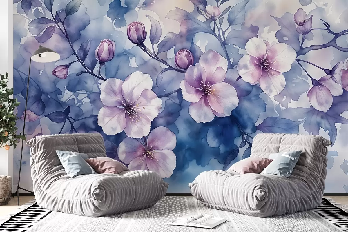 Τοιχογραφίες Λεπτή υδατογραφία απομίμηση ροζ και μοβ λουλουδιών με μαλακά, θολά πέταλα σε μπλε φόντο με παφλασμό Nr. w08582