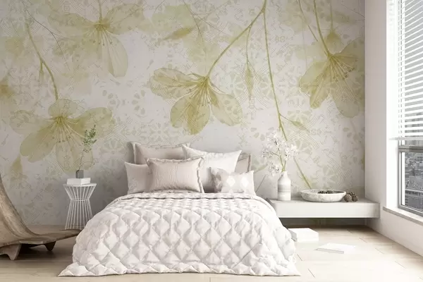 Τοιχογραφίες Λεπτά κίτρινα και λευκά λουλούδια με μακρύ μίσχο και πέταλα σε ένα απαλό, θολό φόντο με υφή Nr. w08588v2