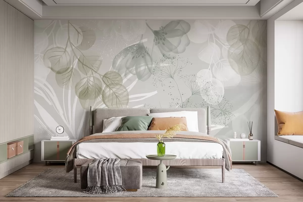 Τοιχογραφίες Floral eucaliptus στοιχεία σε αποχρώσεις του πράσινου και του λευκού με επικαλυπτόμενα φύλλα και πέταλα σε μινιμαλιστικό στυλ Nr. w08599v1