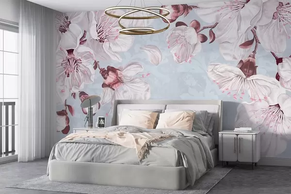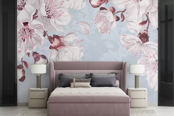 Τοιχογραφίες Φλοράλ εκτύπωση με μεγάλα ροζ και λευκά ανθισμένα λουλούδια κερασιάς σε γαλάζιο φόντο με υφή Nr. w08601