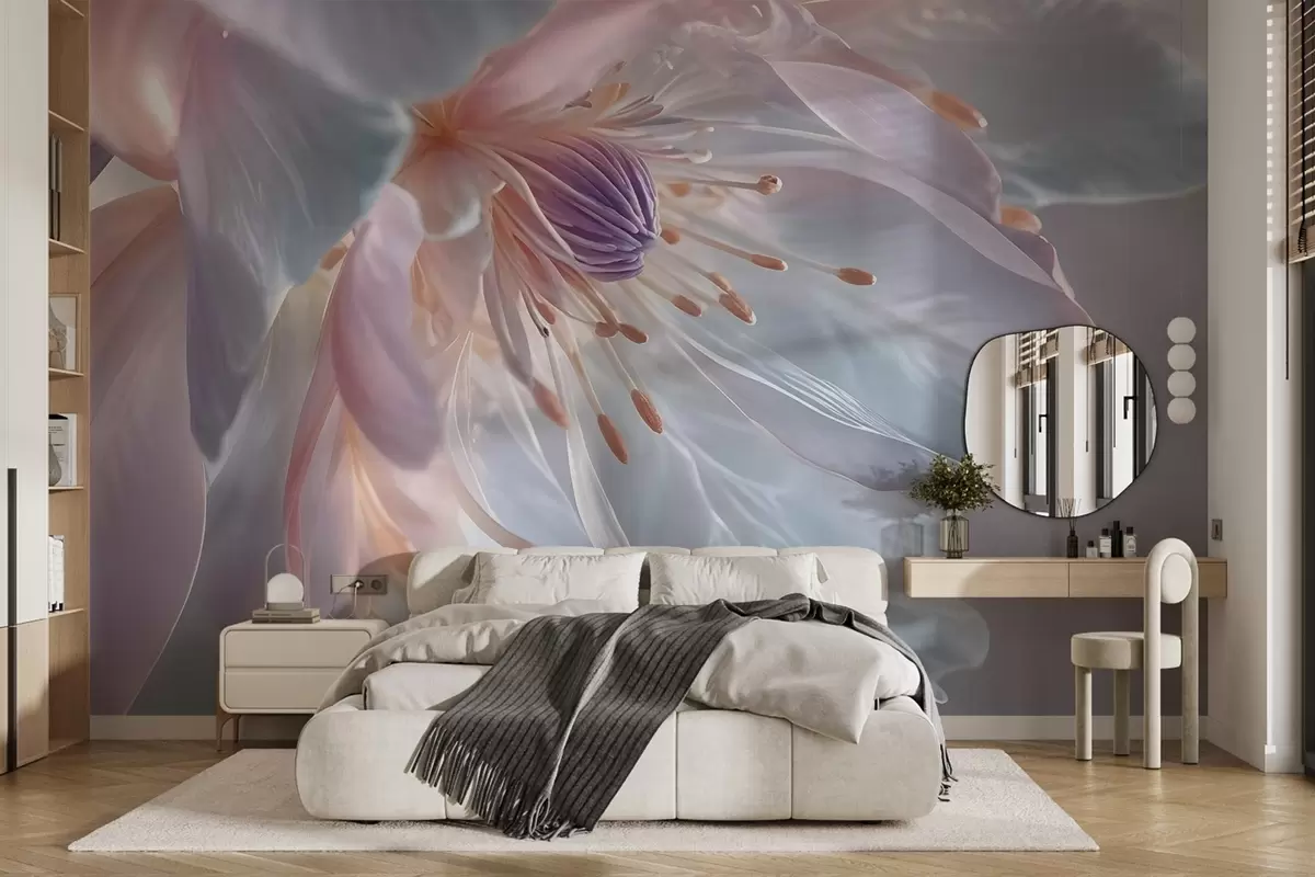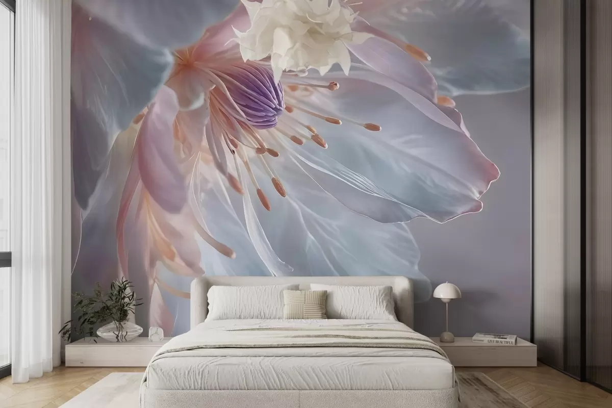 Τοιχογραφίες Κοντινό πλάνο ενός ντελικάτου, παστέλ χρώματος λουλουδιού με απαλά, ημιδιαφανή πέταλα και ζωντανό κέντρο Nr. w08605