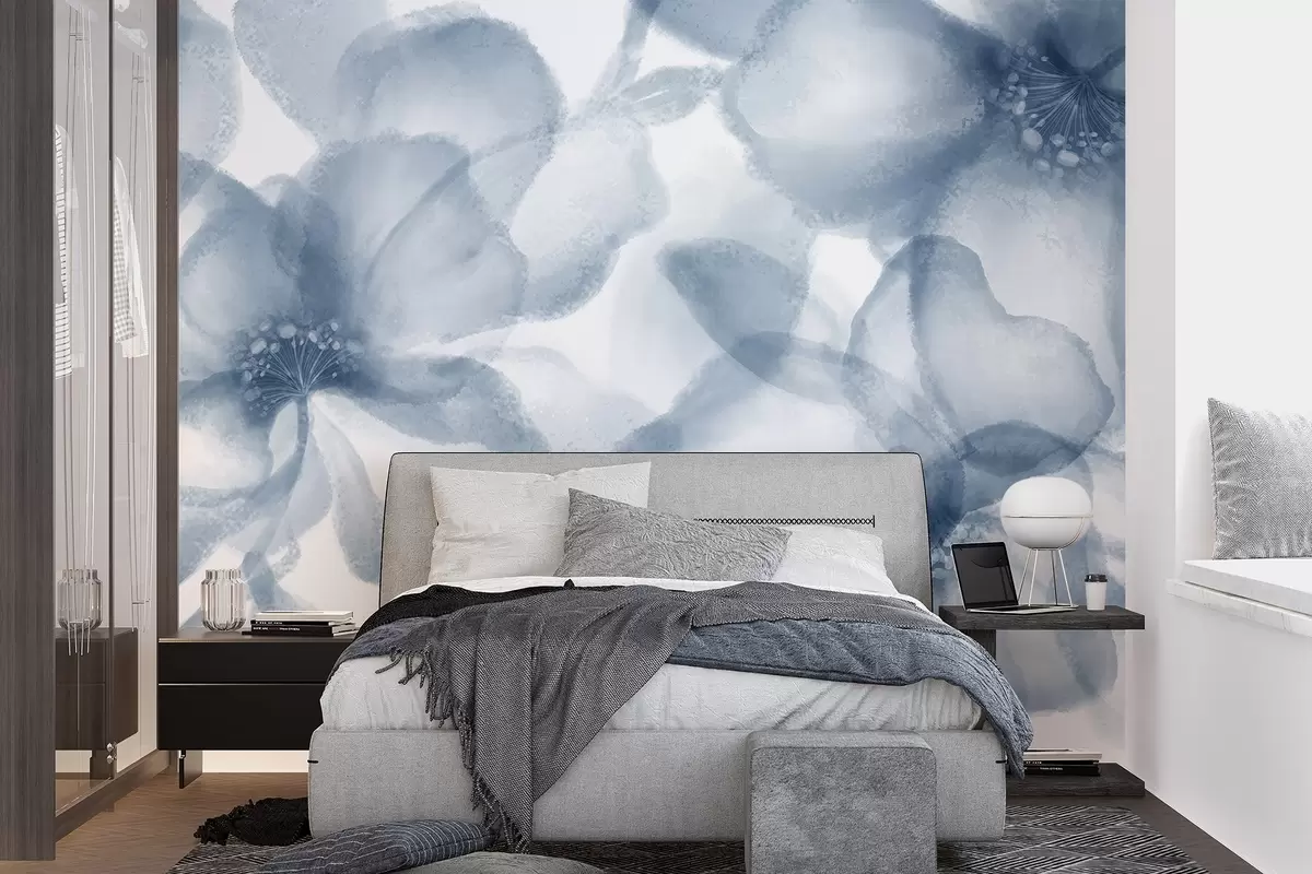 τοιχογραφίες Μαλακά, θολά αφηρημένα μπλε λουλούδια που δημιουργούν ένα γαλήνιο και ηρεμιστικό floral print w08607
