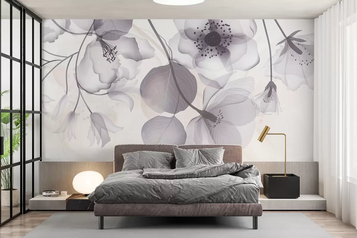 Τοιχογραφίες Λεπτά γκρι και μπεζ ημιδιαφανή λουλούδια με απαλά πέταλα και σκούρα κέντρα, σε ανοιχτό φόντο Nr. w08613v2