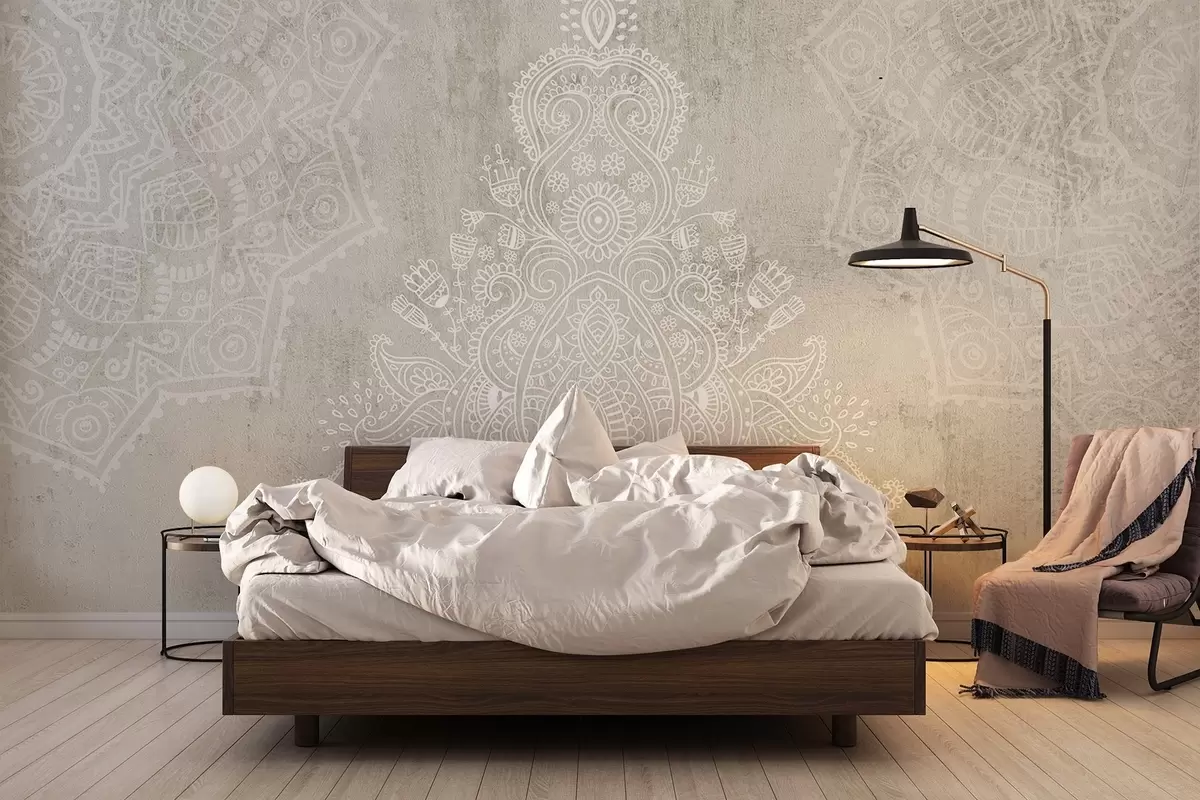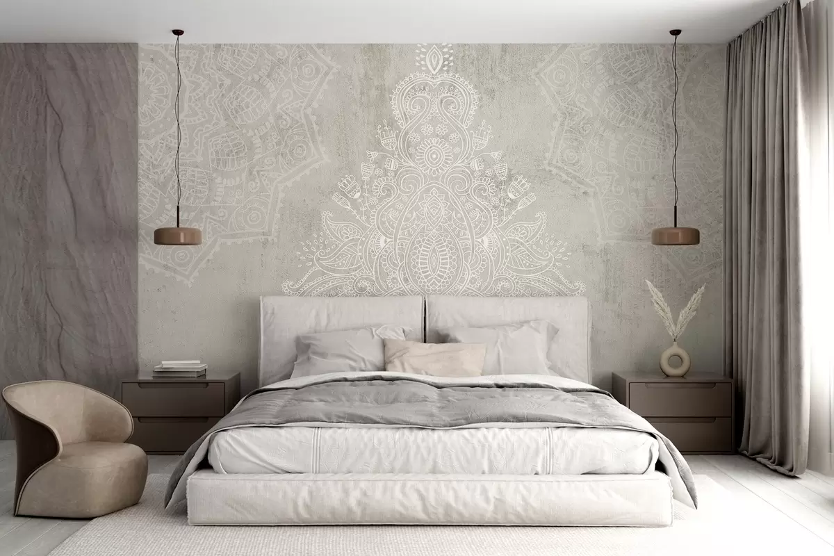 Τοιχογραφίες Λεπτομερής, περίπλοκη εκτύπωση λευκής δαντέλας μαντάλα σε ανοιχτό μπεζ αφηρημένο φόντο Nr. w08614