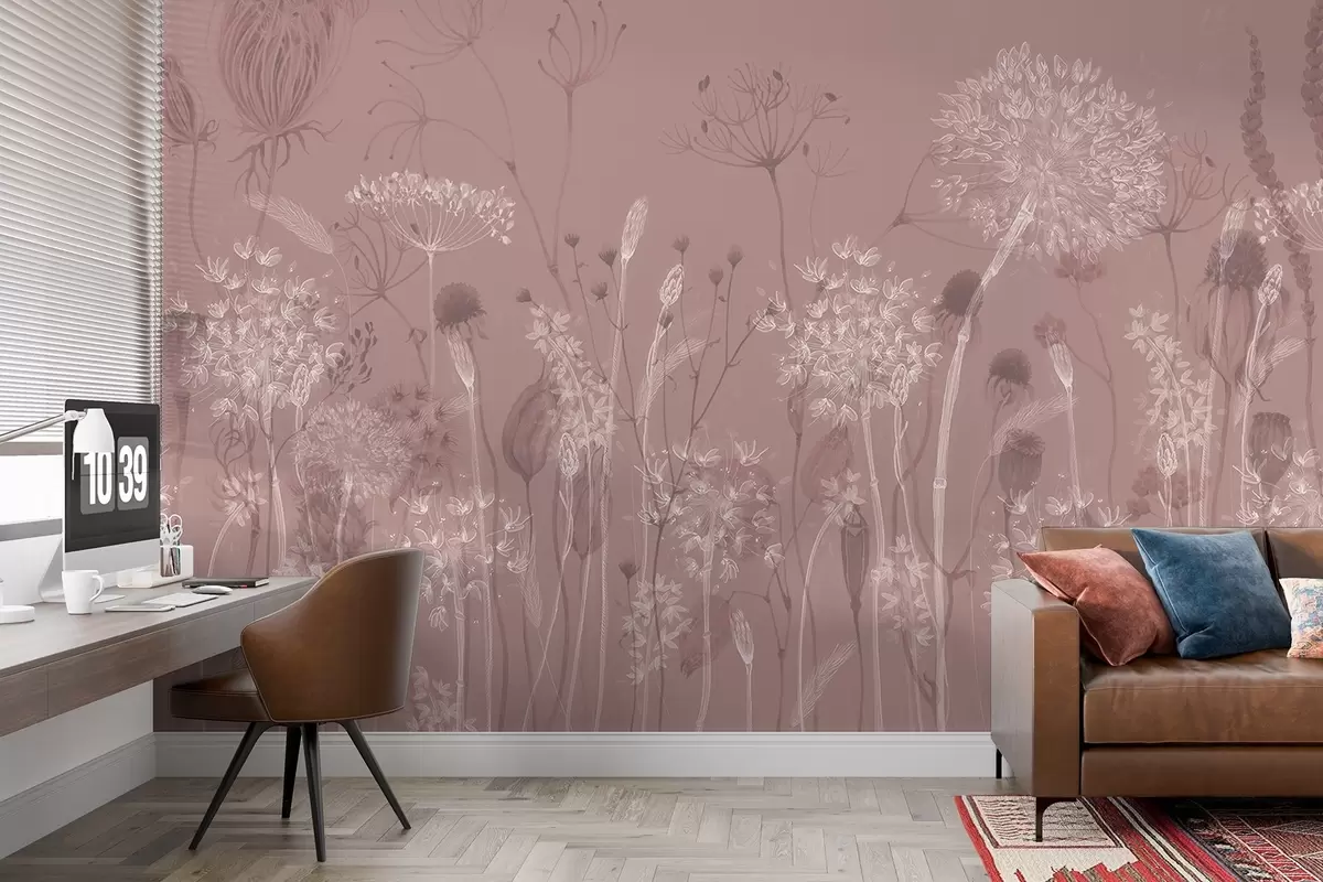 Τοιχογραφίες Αέρινα πικραλίδες και αγριολούλουδα σε στυλ ακουαρέλας σε ροζ αποχρώσεις Nr. w08637v1