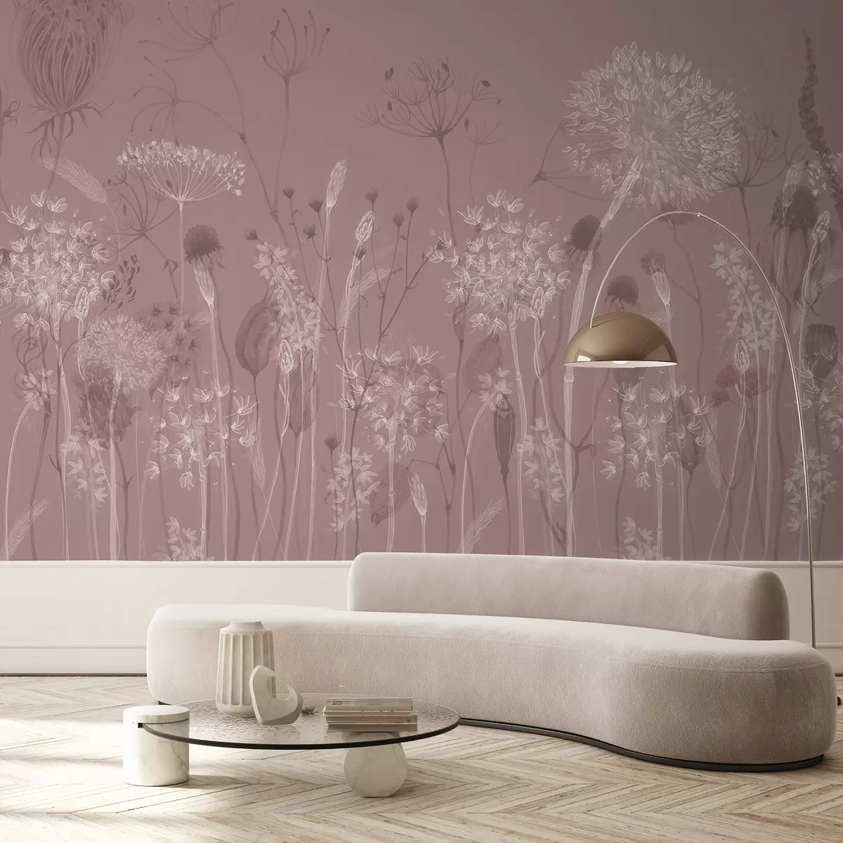 Τοιχογραφίες Αέρινα πικραλίδες και αγριολούλουδα σε στυλ ακουαρέλας σε ροζ αποχρώσεις Nr. w08637v1