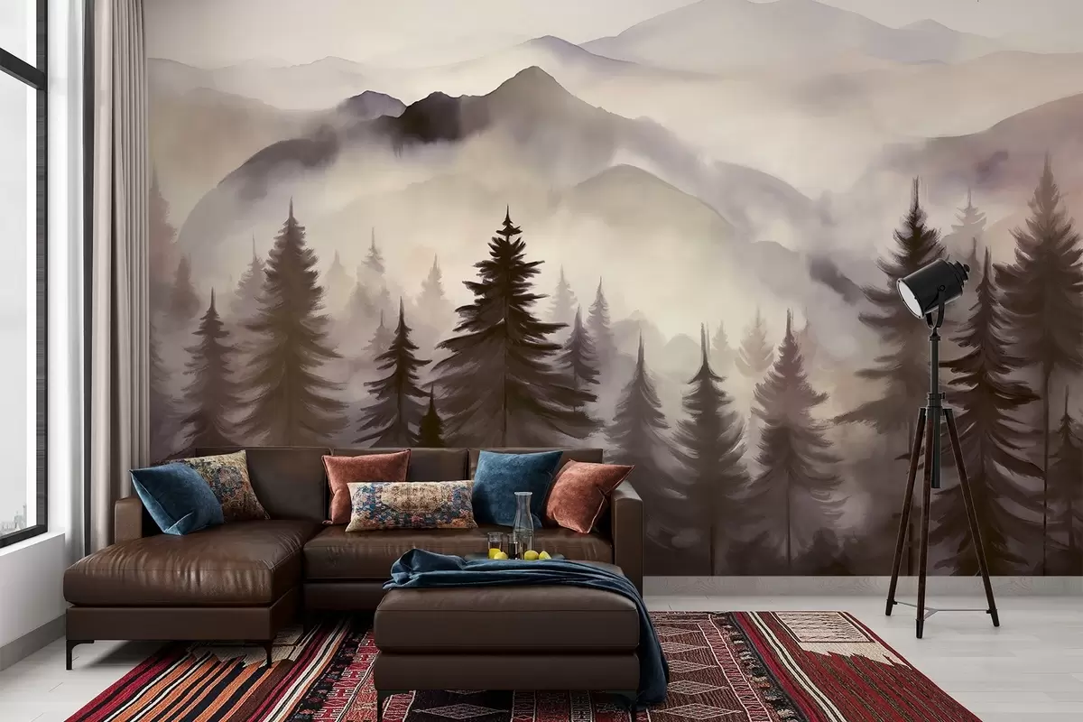 Τοιχογραφίες Ορεινό τοπίο με ένα δάσος από πεύκα και πολυεπίπεδα βουνά κατά τη διάρκεια της αυγής με ελαφριά ομίχλη υδατογραφία απομίμηση τέχνης Nr. w08639v1