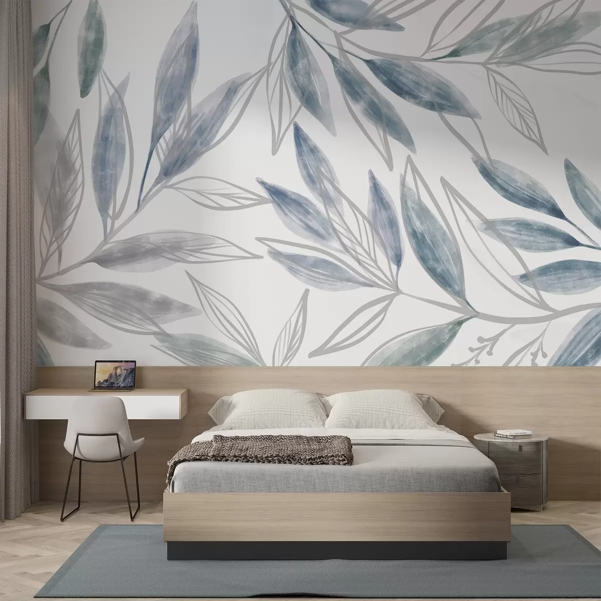 Τοιχογραφίες Λεπτά μπλε και γκρι παστέλ φύλλα με υφή , δημιουργώντας μια γαλήνια και μινιμαλιστική βοτανική σύνθεση Nr. w08642v1