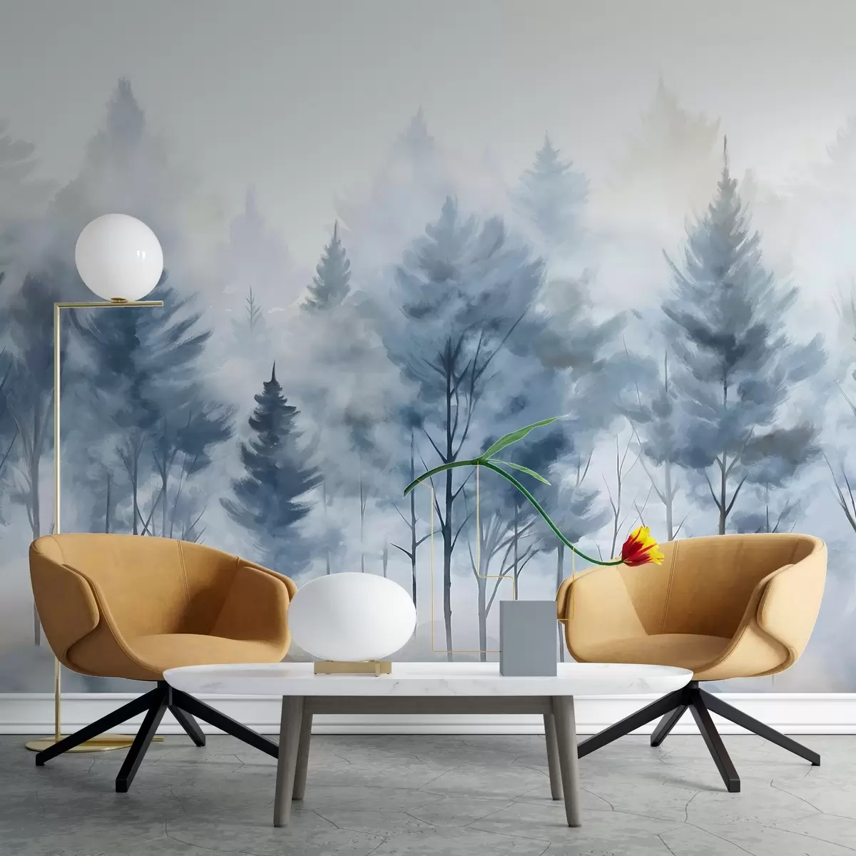 Τοιχογραφίες Ένα ομιχλώδες δασικό τοπίο με ψηλά πεύκα και γυμνά φυλλοβόλα δέντρα στο προσκήνιο ακουαρέλα απομίμηση τέχνης Nr. w08643