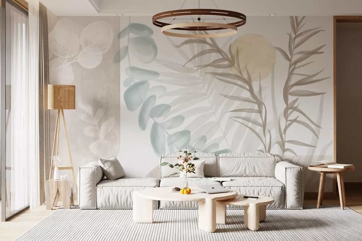 Τοιχογραφίες Ένα μινιμαλιστικό αφηρημένο σχέδιο με στυλιζαρισμένα φύλλα και ευκάλυπτο με απαλές, μπεζ οργανικές φόρμες σε απαλά παστέλ χρώματα Nr. w08648