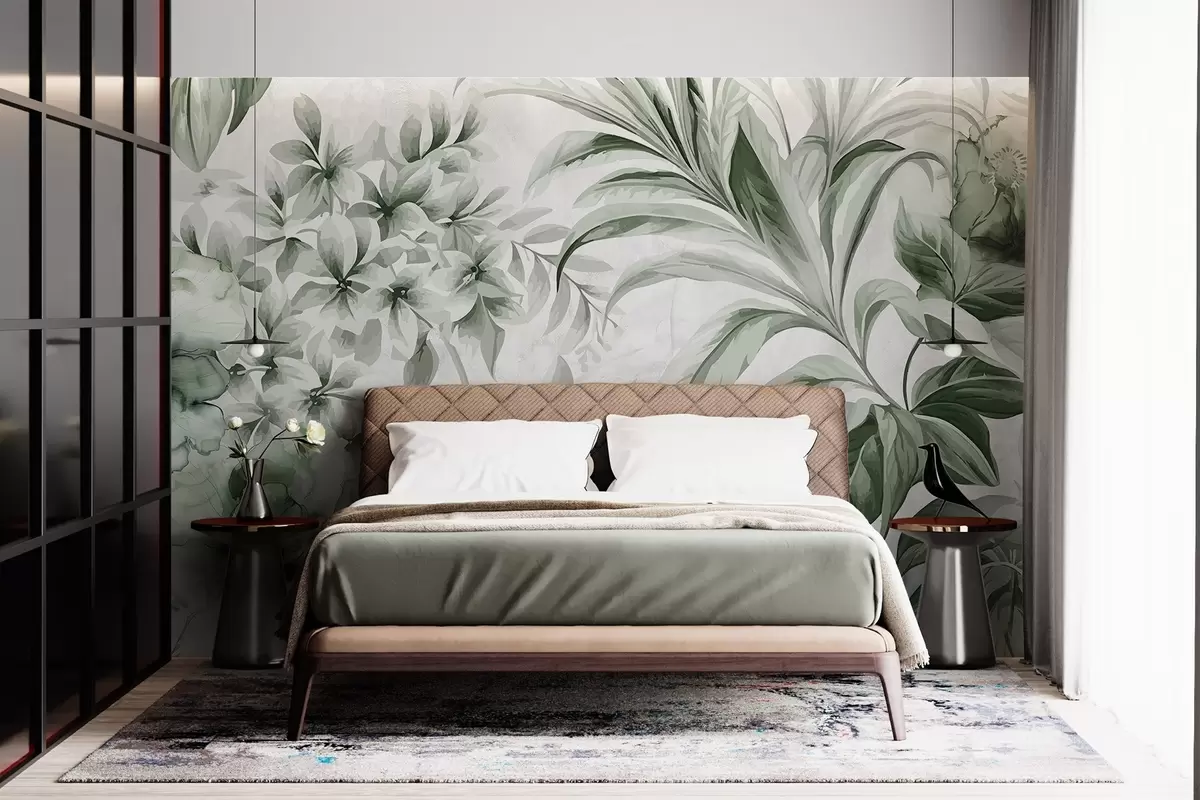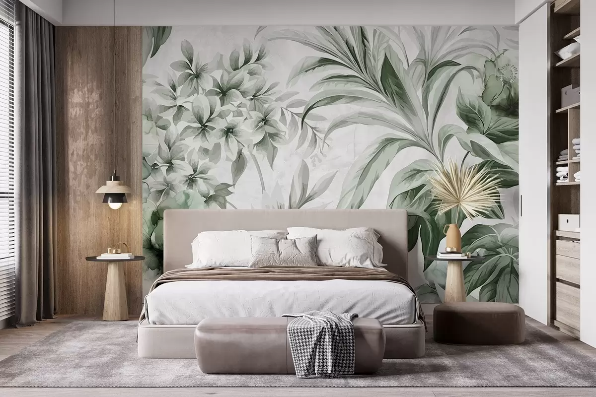 Τοιχογραφίες Τροπικά φύλλα και φυλλώματα σε μια υποτονική παλέτα που κυμαίνεται από ανοιχτές έως σκούρες αποχρώσεις του πράσινου σε ανοιχτόχρωμο φόντο με υφή Nr. w08650
