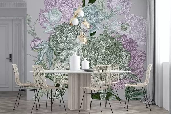 Τοιχογραφίες Λεπτομερές σχέδιο με λουλουδάτη γραμμή που περιλαμβάνει μεγάλες παιώνιες και φύλλα σε αποχρώσεις του πράσινου, του ροζ και του λιλά Nr. w08663v1