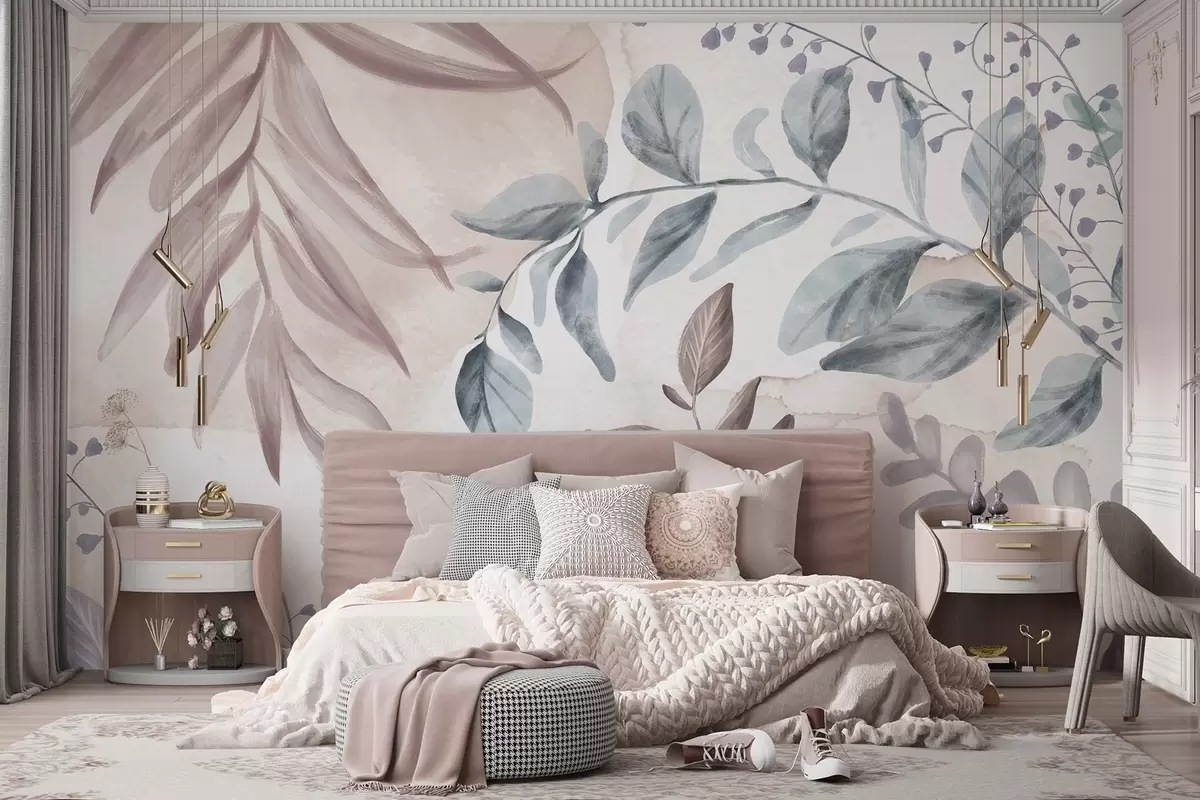 Τοιχογραφίες Βοτανική εκτύπωση με φύλλα και κλαδιά λουλουδιών σε απαλά παστέλ χρώματα, σε φόντο που μοιάζει με ακουαρέλα Nr. w08668