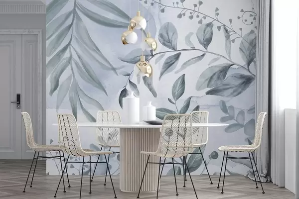 Τοιχογραφίες Βοτανική εκτύπωση με φύλλα και κλαδιά λουλουδιών σε απαλά παστέλ χρώματα, σε φόντο που μοιάζει με ακουαρέλα Nr. w08668v1