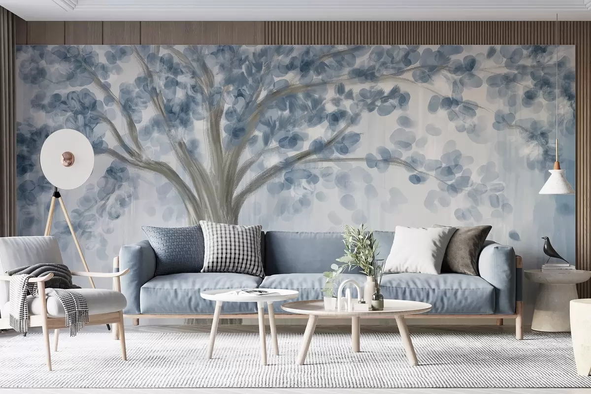 Τοιχογραφίες Ένα μεγάλο δέντρο με μαλακά, αφηρημένα φύλλα σε μπλε χρώμα σε ένα ανοιχτό, ουδέτερο φόντο που ενισχύει τους τόνους του δέντρου Nr. w08669v1