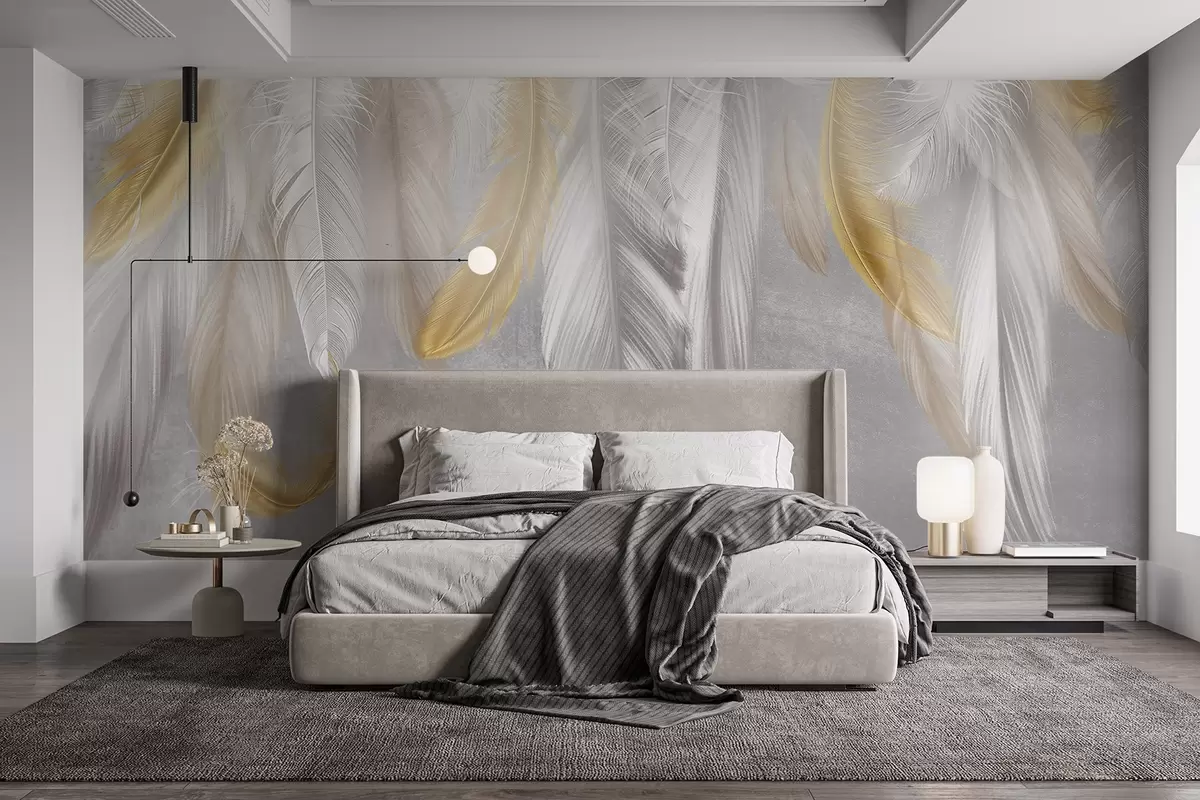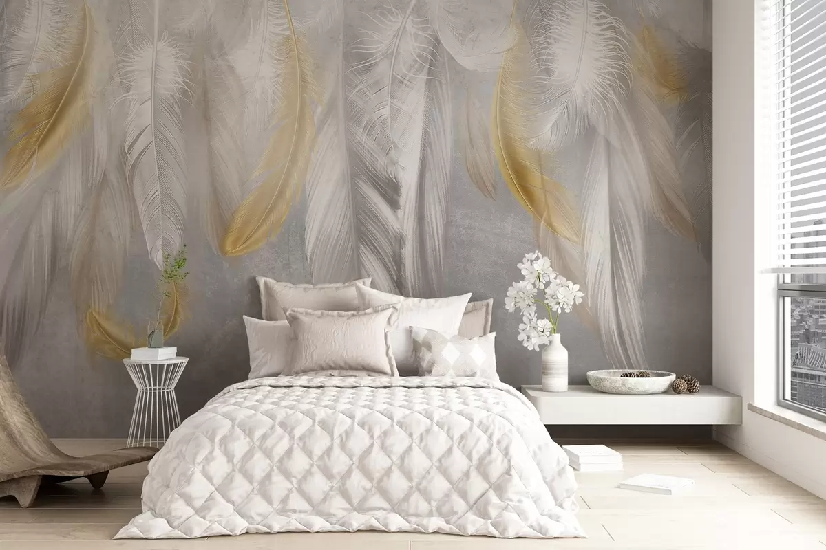 Τοιχογραφίες Λευκά και κίτρινα φτερά κρέμονται σε απαλό γκρι φόντο, δημιουργώντας μια λεπτή και ευάερη σύνθεση Nr. w08670