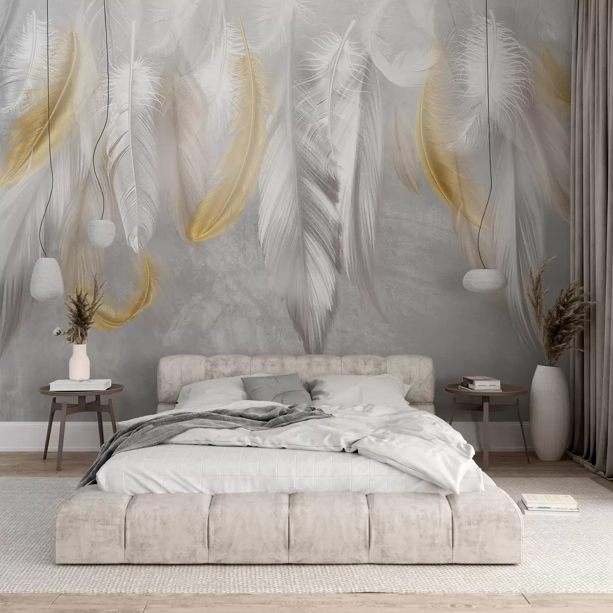 Τοιχογραφίες Λευκά και κίτρινα φτερά κρέμονται σε απαλό γκρι φόντο, δημιουργώντας μια λεπτή και ευάερη σύνθεση Nr. w08670
