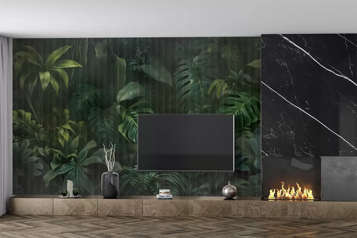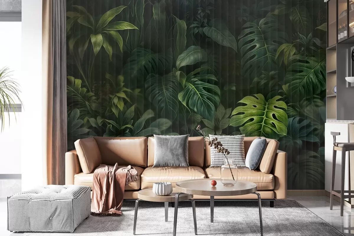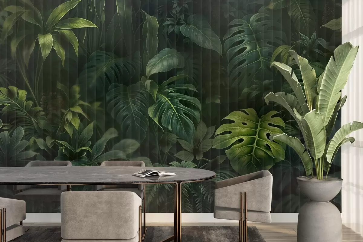 Τοιχογραφίες Τροπική σκούρα θολή και υφασμάτινη εκτύπωση με διάφορα πράσινα φύλλα, συμπεριλαμβανομένων monstera και φύλλα φοίνικα Nr. w08673
