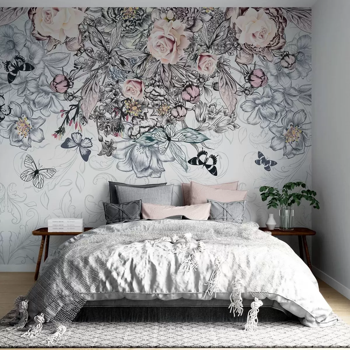 Τοιχογραφίες Ένα floral σχέδιο με ροζ τριαντάφυλλα και διάφορα λουλούδια και πεταλούδες με περίπλοκη γραμμή τέχνης σε υφή φόντο Nr. w08674